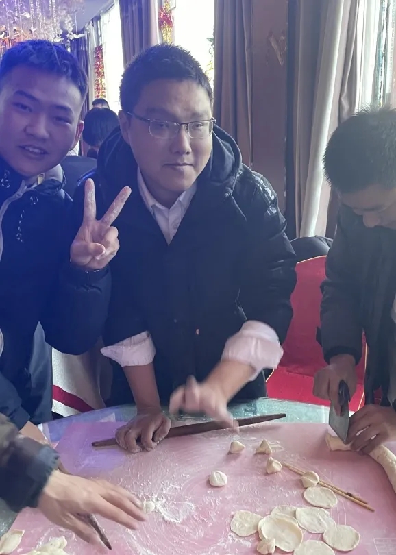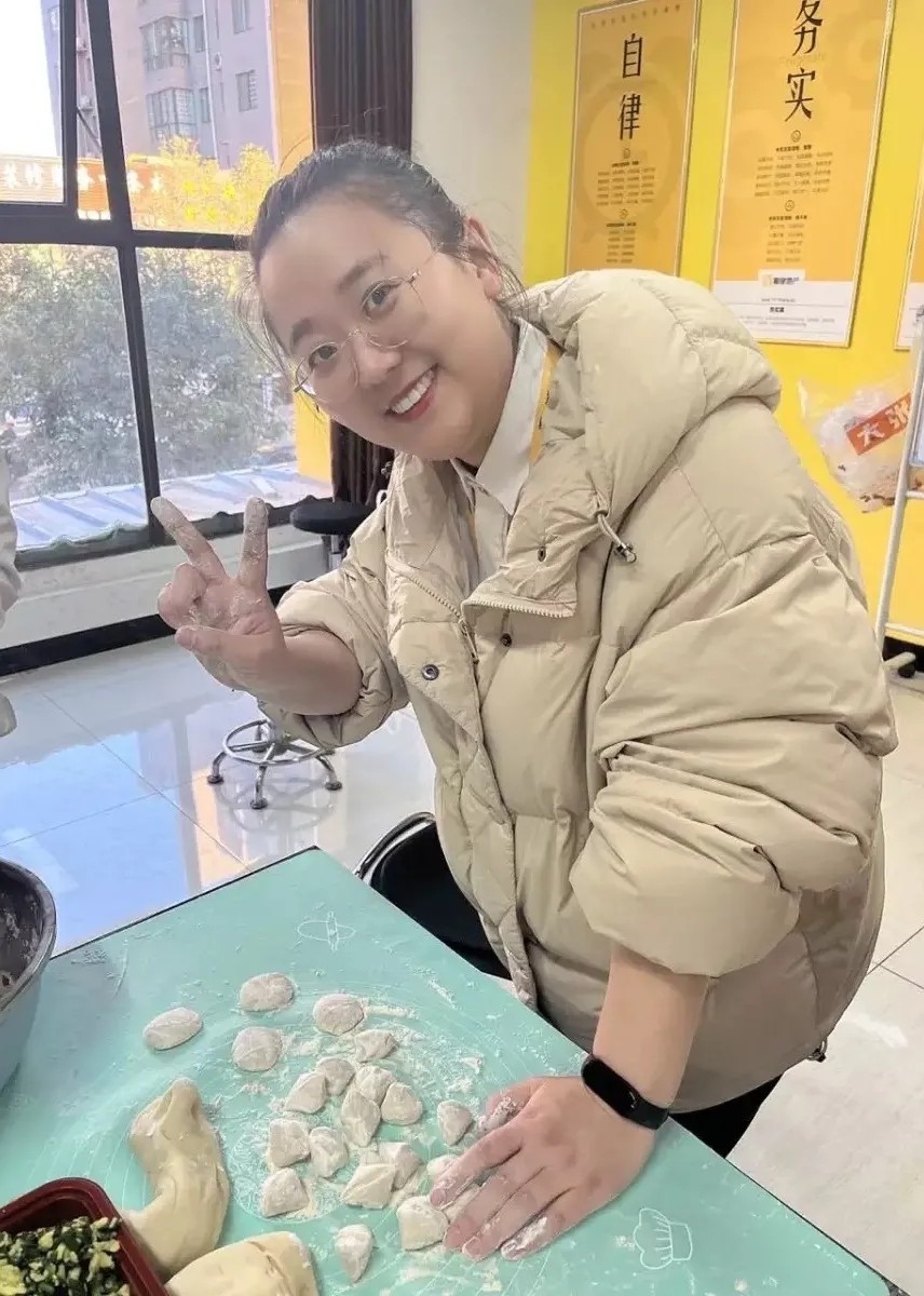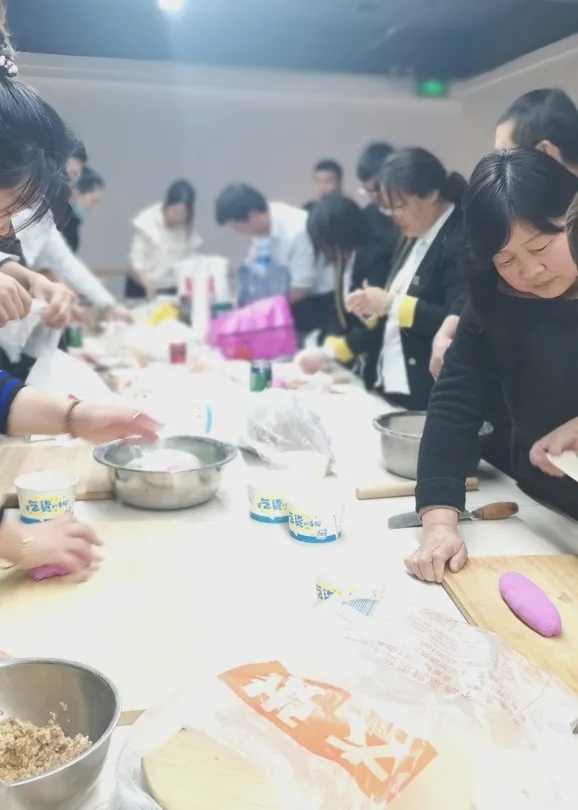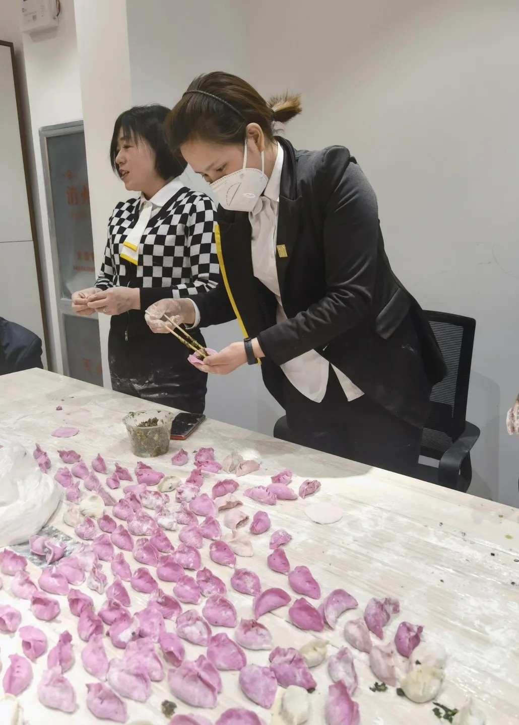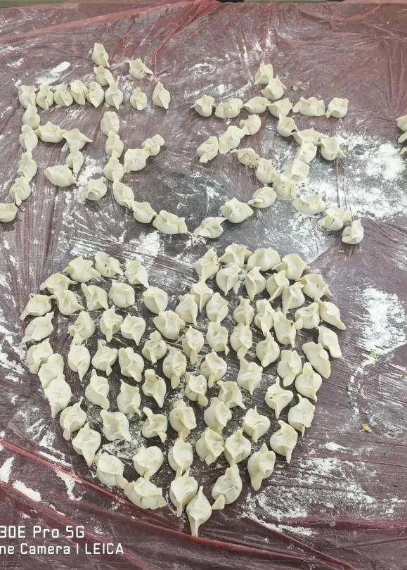 和面、搟皮、包餃子,大家很快進(jìn)入各自的角色,井然有序地忙活起來(lái)。只見(jiàn)他們把餃子皮攤在手心,用筷子夾餡料放在皮中間,開(kāi)始合攏捏花紋,不一會(huì )一個(gè)個(gè)成型的餃子立馬誕生,各種花式餃子悉數亮相,大家時(shí)而探討心得,時(shí)而過(guò)招切磋,一派其樂(lè )融融的景象。
