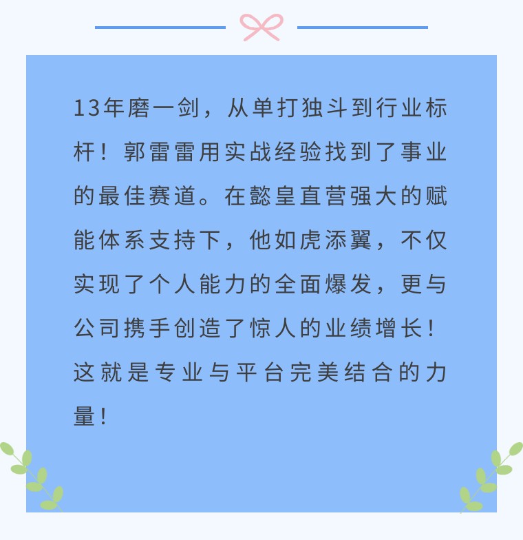 在此,我們也想對在外奮斗的家人們說(shuō),如果你們也面臨與郭雷雷相似的困擾,那么擁有 20 年深厚底蘊、成熟企業(yè)文化與強大支撐賦能體系的懿皇地產(chǎn),定能為你排憂(yōu)解難,成為你事業(yè)騰飛的堅實(shí)后盾!